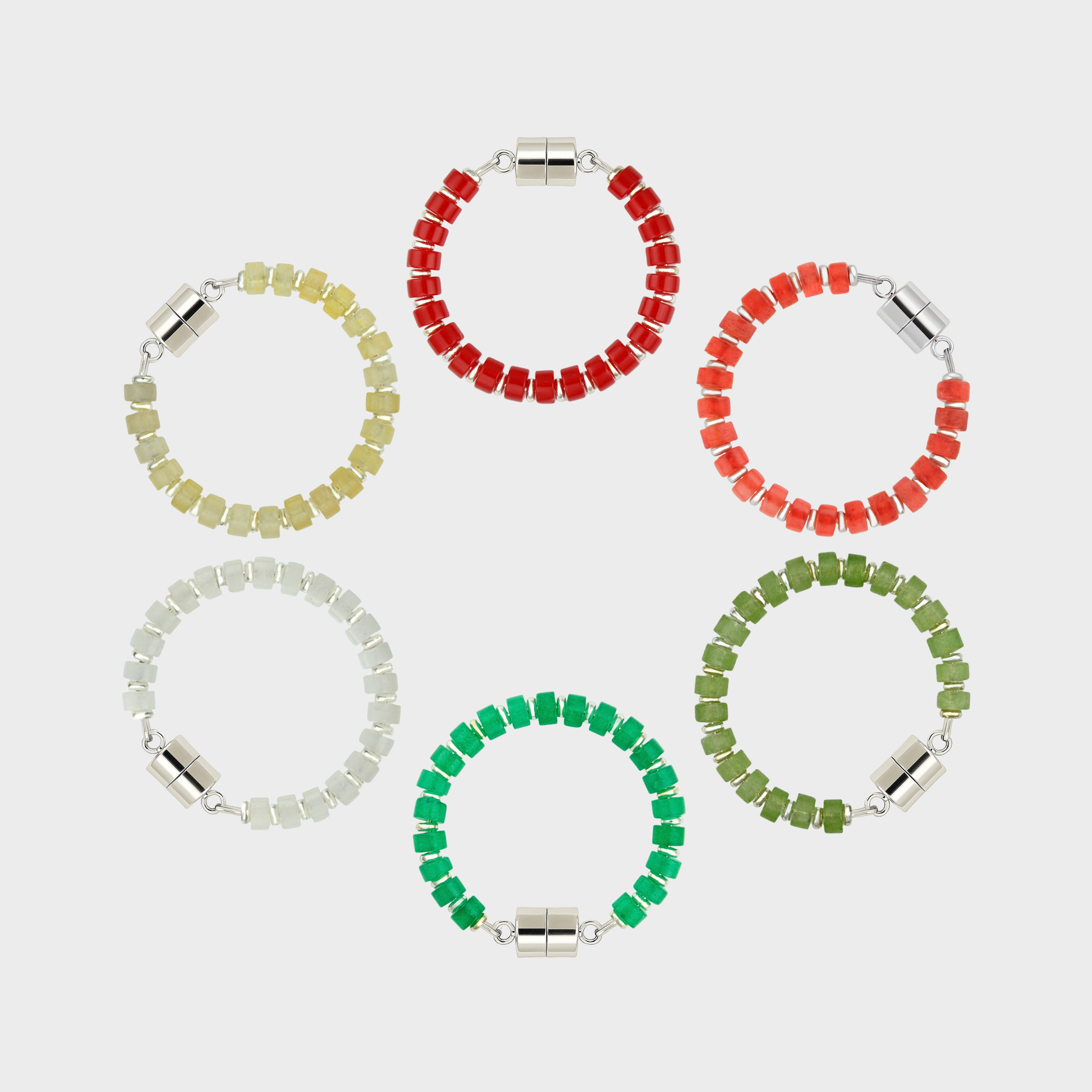 - Chromatic Curation: A set of 6 charms in Champagne Zircon (top left), Red Coral (top center), Red Carnelian (top right), Peridot (bottom right), and Green Jade (bottom center), White Moonstone (bottom left) colors, each measuring approximately 1.5" in width