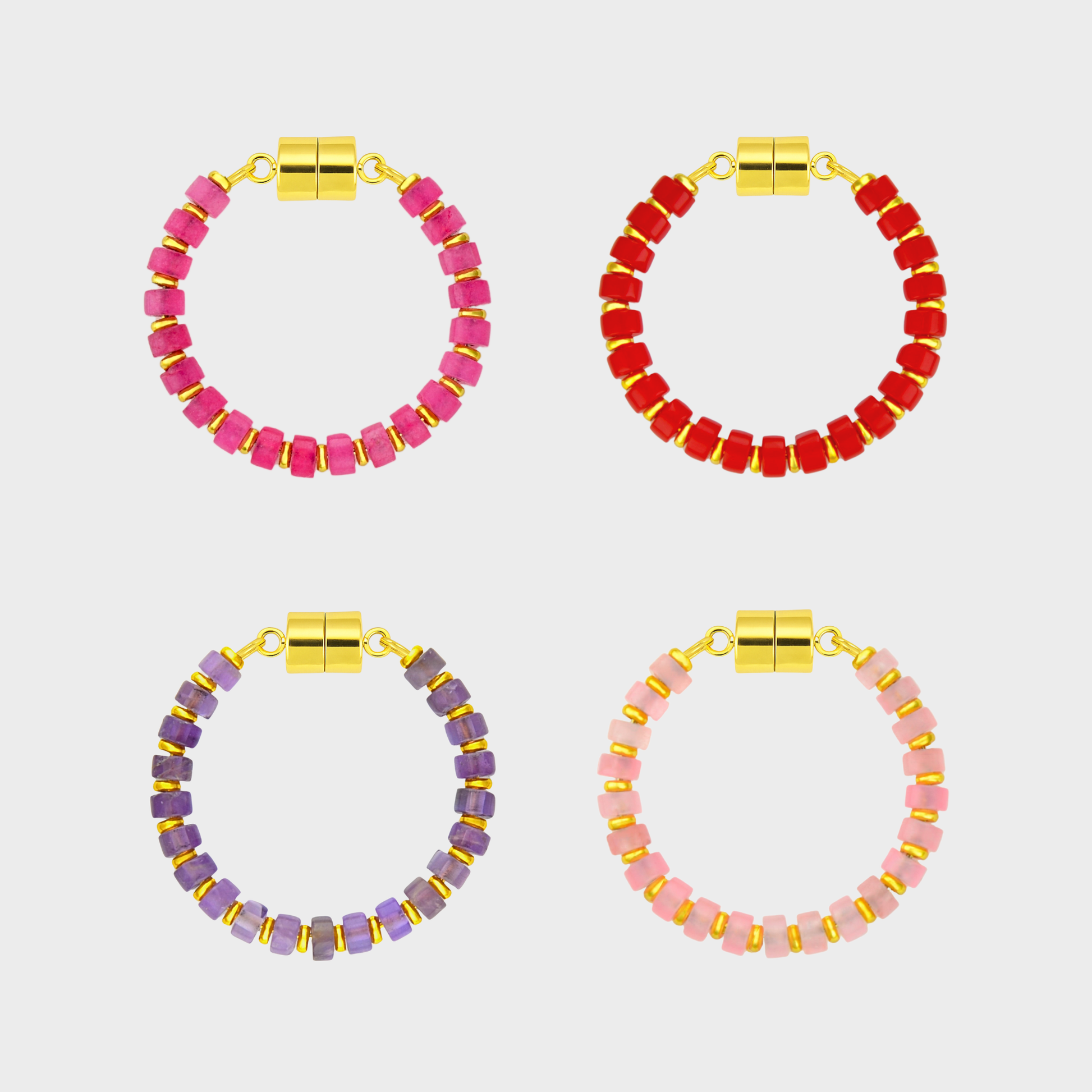 - Chromatic Curation: A set of 4 charms in Spinel (top left), Red Coral (top right), Morganite (bottom left), and Ruby (bottom right) colors, each measuring approximately 1.5" in width